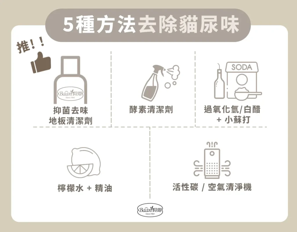 酵素清潔劑是目前最有效的方法,能夠分解貓尿中的尿酸,徹底去除異味,而不是單純掩蓋氣味。其他方式如活性碳、空氣清淨機、白醋加小蘇打,也能輔助減少氣味,但效果相對有限,最根本的解決方案還是使用能分解尿酸的清潔產品。